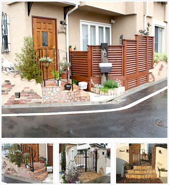 レンガ、フェンス、立水栓、ガーデンテラス、アンティークなポスト、アンティークタイルなど