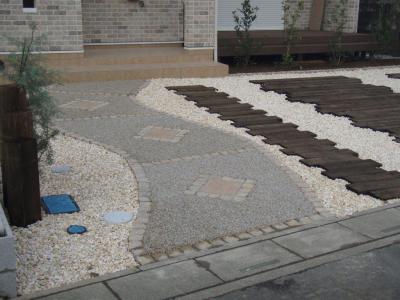 車を置くエリアは枕木を使用し、人の歩く通路は御影石で縁をとり小砂利で舗装しました。
