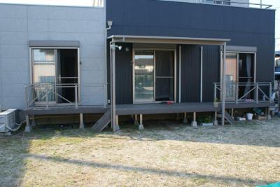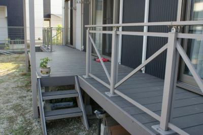 建物に合わせて木樹脂のモダンデッキにテラス屋根も取り付けて雨の日でも安心して洗濯物も乾せますね