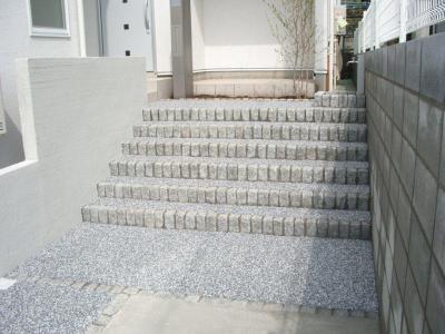 石のもつ風合いが建物の白とマッチしてすっきりとした階段になりました。
