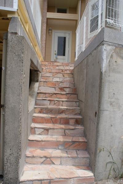 道路から玄関までの階段を天然石で仕上げて家の迫力に負けない階段に仕上げました。